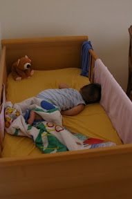 本以為下次醒來應該真的可以是早上五六點了,沒想到半夜三點就又聽到羅蜜蜜唉唉叫,我一直撐,不想起來,可是終於還是因為她實在叫太久了,開始懷疑是不是對水果泥過敏,又起來看她一次. 所以凌晨四點我進她房間去看(我想離半夜12點也四個小時了,可以再去餵她了),結果看到羅蜜蜜竟然仰睡!! 而且已經原地旋轉不知幾度了? 我忍不住覺得好笑,還拿相機去拍. 最後我當然還是餵她吃了超早早點,不過我覺得她這兩次醒來都只是因為自己亂轉又沒辦法恢復到原來的位置而哭哭的! 矮油,害我還擔心什麼對水果泥過敏...